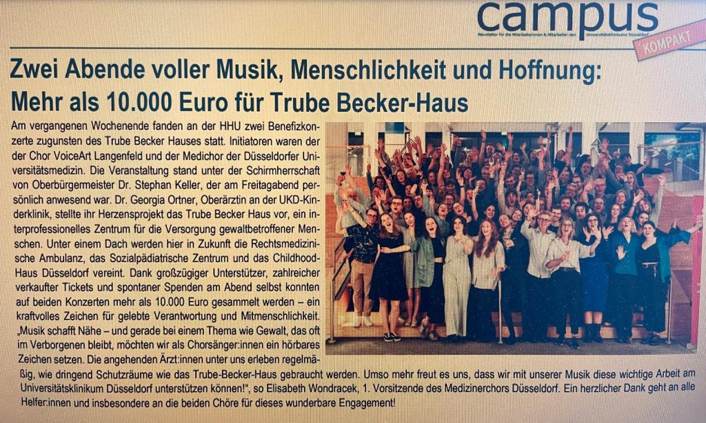 Zwei Chöre – aber eine Stimme für den Kinderschutz: Der Medizinerchor der Heinrich-Heine-Universität Düsseldorf (HHU) und der Chor VoiceArt aus Langenfeld gestalten gemeinsam zwei Benefizkonzerte zugunsten des Trube-Becker-Hauses, das derzeit an der Uniklinik Düsseldorf entsteht. In dem rein spendenfinanzierten Neubau – der Spatenstich fand vor fast genau einem Jahr statt – sollen drei wichtige Uniklinik-Einrichtungen unter einem Dach vereint werden: die Rechtsmedizinische Ambulanz für Gewaltopfer des Institutes für Rechtsmedizin, das Sozialpädiatrische Zentrum der Kinderklinik und das Childhood-Haus Düsseldorf. Europaweit gibt es bislang kaum ein vergleichbares Projekt.